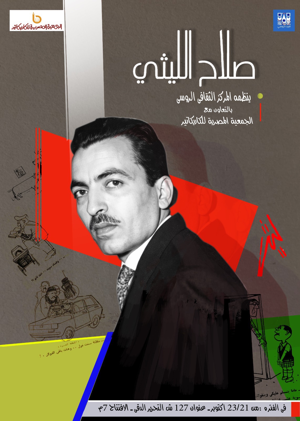 في إطار التعاون الثقافي المثمر بين المركز الثقافي الروسي بالقاهرة والجمعية المصرية للكاريكاتير، تُقام في السابعة من مساء اليوم الثلاثاء 21 أكتوبر 2025، احتفالية خاصة ومعرض فني تكريمي للفنان الكبير صلاح الليثي، أحد أبرز رموز فن الكاريكاتير المصري.