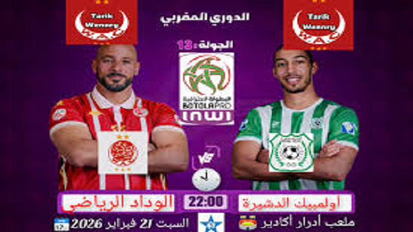 تقدم الوسيلة نيوز خدمة البث المباشر لمشاهدة مباراة أولمبيك الدشيرة مع نظيره الوداد الرياضي، اليوم السبت 10 يناير 2026، وذلك ضمن منافسات الجولة الــ 13 من الدوري المغربي موسم 2025 / 2026.