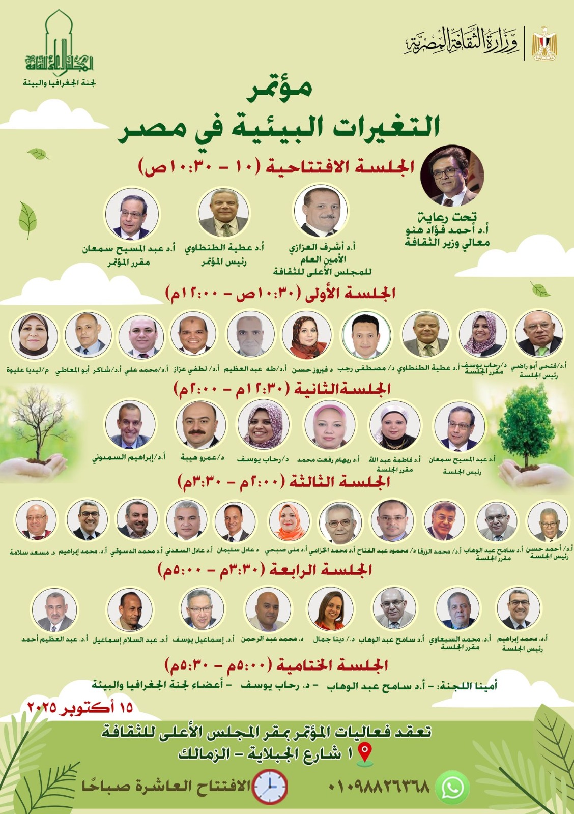 تحت رعاية الدكتور أحمد فؤاد هنو وزير الثقافة، والدكتور أشرف العزازي الأمين العام للمجلس الأعلى للثقافة، يطلق المجلس الأعلى للثقافة مؤتمر: “التغيرات البيئية في مصر”، والذي تنظمه لجنة الجغرافيا والبيئة بالمجلس برئاسة الدكتور عطية الطنطاوي مقرر لجنة الجغرافيا والبيئة، والذي يقام في تمام الساعة التاسعة صباح يوم الأربعاء الموافق ١٥ أكتوبر الحالي وتمتد الفعاليات حتى الخامسة والنصف مساء، بمقر المجلس الأعلى للثقافة باحة دار الأوبرا المصرية.