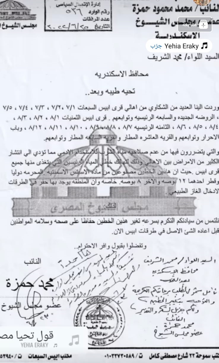 تقدم “محمد حمزه”عضو مجلس الشيوخ عن حزب مستقبل وطن بالإسكندرية بطلب للواء “محمد الشريف”محافظ الثغر مطالبا بأحلال وتجديد شبكة مياه الشرب بقري ابيس التابعة لقسم “محرم بك “بحي وسط .