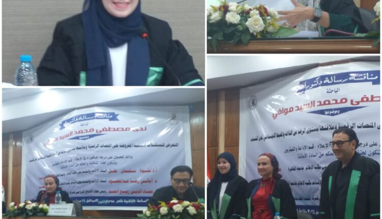 حيث حصلت ندى مصطفى على درجة الدكتوراه عن رسالة بعنوان “ التعرض للمسلسلات الأجنبية المعروضة على المنصات الرقمية وعلاقتهابمستوى الرضا عن الذات والمحيط الأجتماعى لدى الشباب